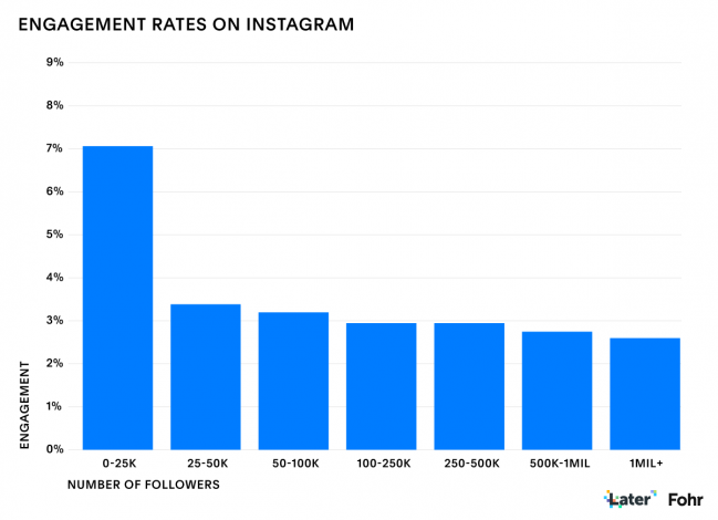 و پس از تحلیل پستهای اینفلوئنسرها، Fohr دریافت که میکرو اینفلوئنسرها بیشترین نرخ مشارکت (به طور میانگین %7) را در پستهای فید خود دارند. در واقع، اینفلوئنسرهایی با تعداد فالوور 0-25 هزار، بیشترین نرخ مشارکت را بدون توجه به زمینهی فعالیت، مخاطب هدف یا موضوعات دارند.