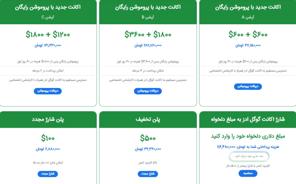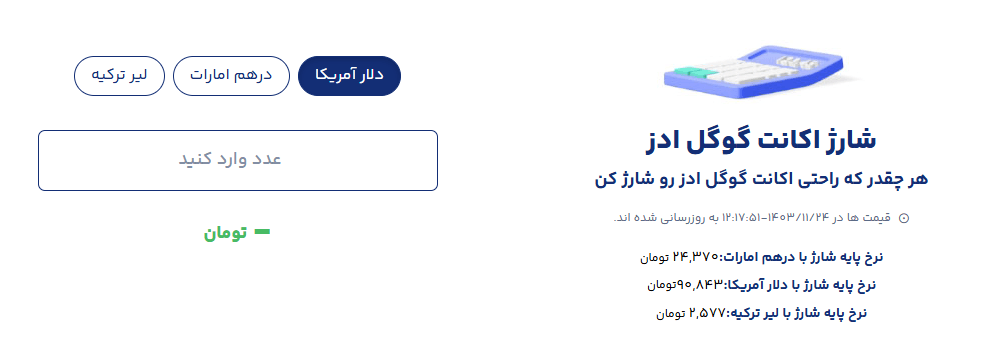 شرکت برتینا فقط حسابهای شمارو با دلار آمریکا شارژ میکند و قیمت محاسبه دلار خود رو در صفحه شارژ اکانت گوگل ادز مشخص نکرده است .