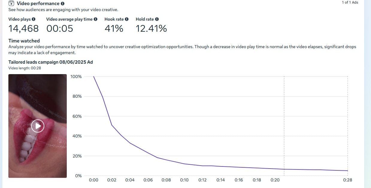نتایج نشان میدهد که شروع ویدئو توانسته بهخوبی توجه را جلب کند اما نگهداشت مخاطب پایین است. این نکته حاکی از نیاز به بهبود ساختار، ریتم یا انتقال CTA در همان چند ثانیه اول است.