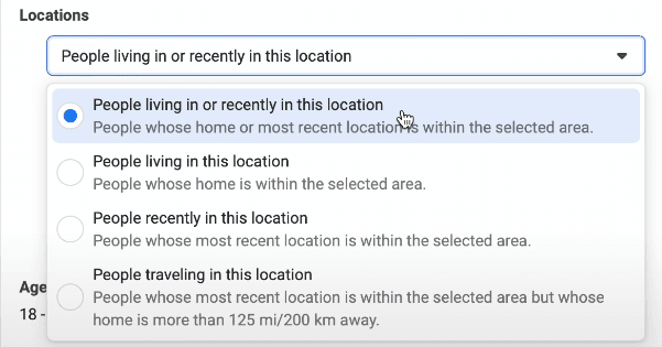 •انتخاب لوکیشن کاربران: بین گزینههای مختلف، بهترین گزینه “People Living in this location” است. به صورت پیشفرض روی گزینه اول قرار دارد که در این صورت هم افرادی که در این لوکیشن زندگی میکنند تارگت میشوند و هم افرادی که به تازگی به آنجا سفر کردهاند.